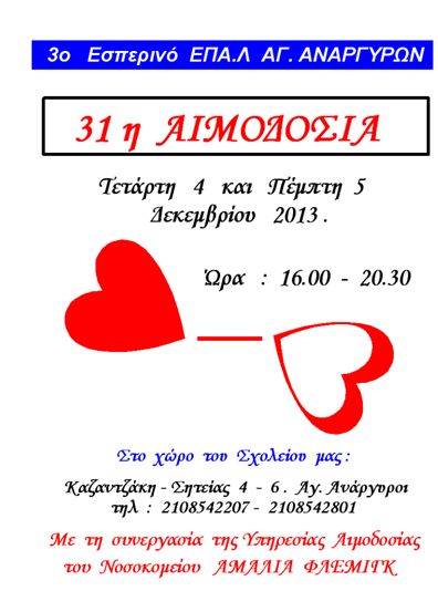 31η αιμοδοσία στο 3ο Εσπερινό ΕΠΑΛ Αγ. Αναργύρων 4-5/12