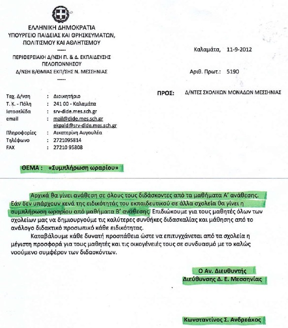 Το ΔΣ της Α΄ ΕΛΜΕ Μεσσηνίας καταδικάζει και απορρίπτει την υπ’ αριθμό 5190/11-09-2012 απόφαση του Αναπληρωτή Δ/ντη Δ/θμιας Εκπ/σης Μεσσηνίας κ. Ανδρεάκου Κωνσταντίνου, η οποία αναφέρεται στην συμπλήρωση ωραρίου των εκπαιδευτικών.