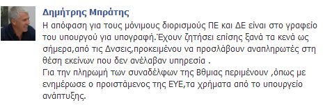 Πριν λίγο ο αιρετός του ΚΥΣΠΕ Δημήτρης Μπράτης ενημέρωσε την προσωπική του σελίδα στο facebook για το πότε θα γίνουν οι πληρωμές των αναπληρωτών και τι περιμένει το υπουργείο. Επίσης έγραψε για τους μόνιμους διορισμούς και πότε θα γίνουν ξανά προσλήψεις αναπληρωτών