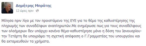 Ο αιρετός του ΚΥΣΠΕ Δημήτρης Μπράτης ανακοίνωσε στη σελίδα του στο facebook για την καθυστέρηση της πληρωμής των αναπληρωτών. Οι εκπαιδευτικοί των ολοήμερων θα πληρωθούν κανονικά απλώς καθυστέρησε η δόση του Ιανουαρίου και την Τετάρτη ο γγ του υπουργείου θα υπογράψει για την εκταμίευση.