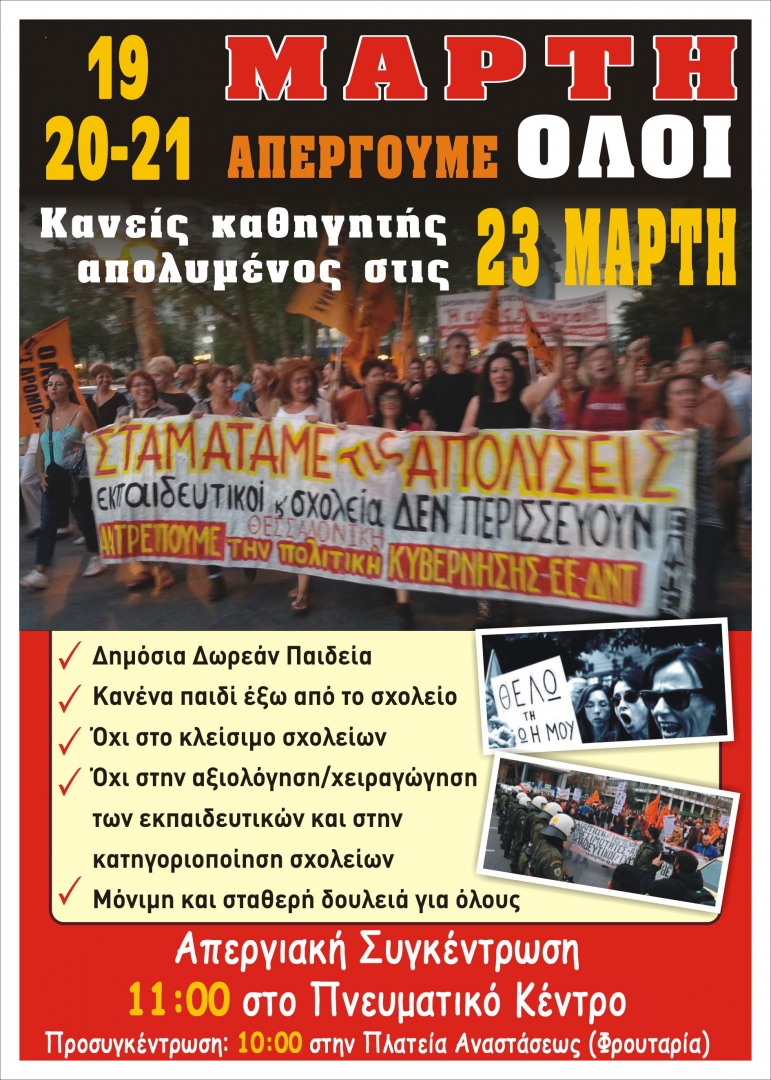 Σας καλούμε όλους να συμμετέχετε στην απεργιακή συγκέντρωση που διοργανώνουμε την Τέταρτη 19/03/14 στις 11 π.μ. στο Πνευματικό Κέντρο αλλά και νωρίτερα στην πορεία που θα πραγματοποιήσουμε ξεκινώντας από τη πλατεία Ανάστασης στις 10 π.μ.