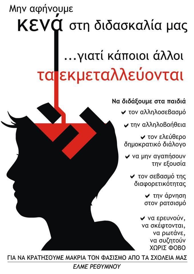 Αν σήμερα ο κυρίαρχος λόγος και τα ιδεολογικά τοτέμ ενός κράτους ανισότητας και αποκλεισμών υψώνονται στο χώρο του σχολείου, ένα άλλο αντίπαλο ρεύμα αμφισβήτησης και απελευθερωτικής εκπαίδευσης μπορεί να υψώσει τα δικά του λάβαρα.