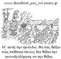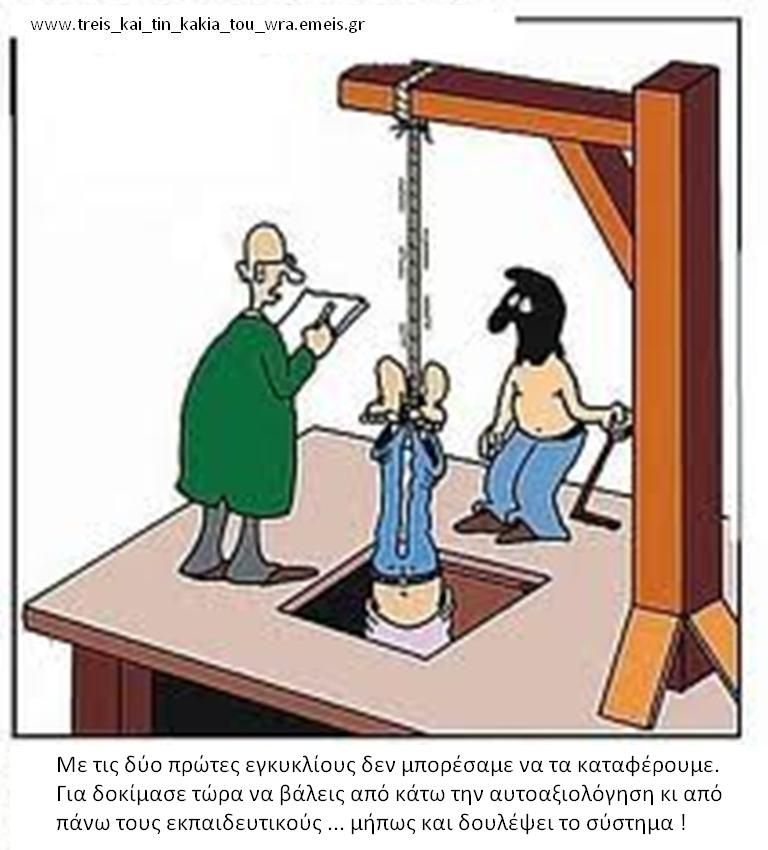 - Οι εκπαιδευτικοί στο σύνολό τους αρνούνται – όπως είναι φυσικό – την αυτοχειρία της αυτοαξιολόγησης. Η αξιολόγηση δεν «περπατάει» στα σχολεία και στην κοινωνία, όσα εκατομμύρια ευρώ κι αν ξοδέψουν κι όσο κι αν τη διαφημίσουν. Ο μόνος τρόπος που τους έμεινε πια είναι ο εξαναγκασμός. Το μόνο «επιχείρημα» που έχουν είναι ο φόβος κι η απειλή. Κι αυτό δείχνει και το τι ακριβώς είναι η αξιολόγηση – αυτοαξιολόγηση που θέλουν να φέρουν.