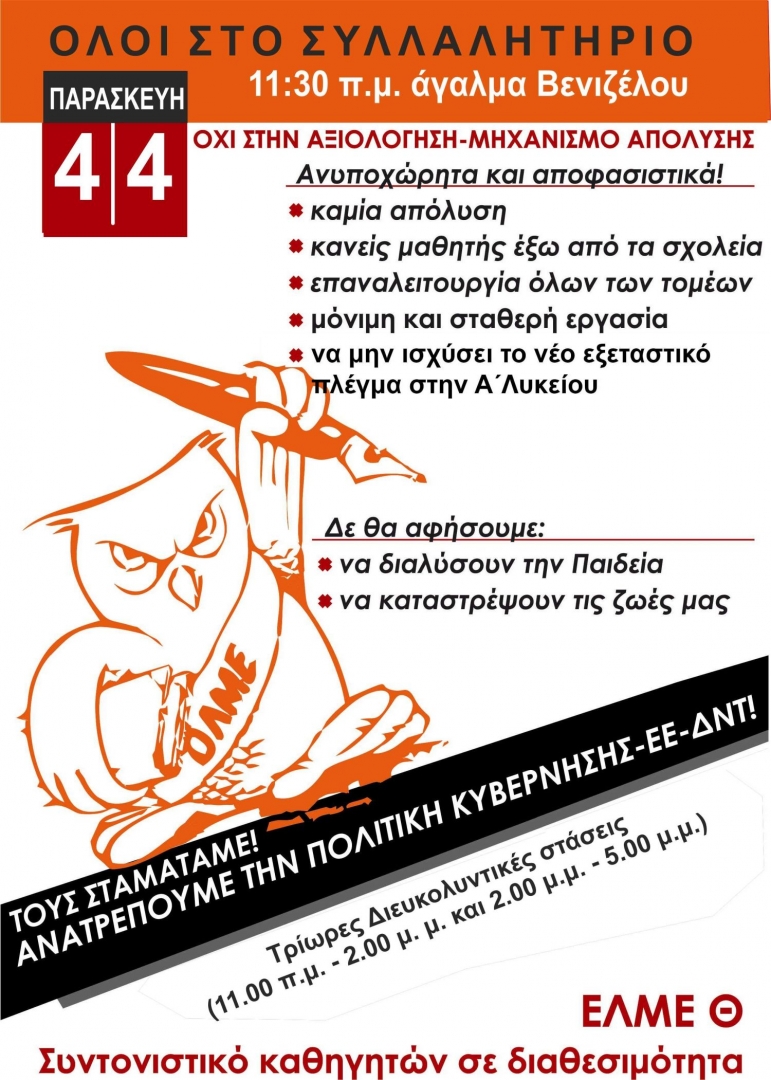 Ολοι στο συλλαλητήριο στις 11:30 στο άγαλμα Βενιζέλου την Παρασκευή 4 Απριλίου 2014. Οχι στην αξιολόγηση και μηχανισμό απόλυσης. Ανυποχώρητα και αποφασιστικά.