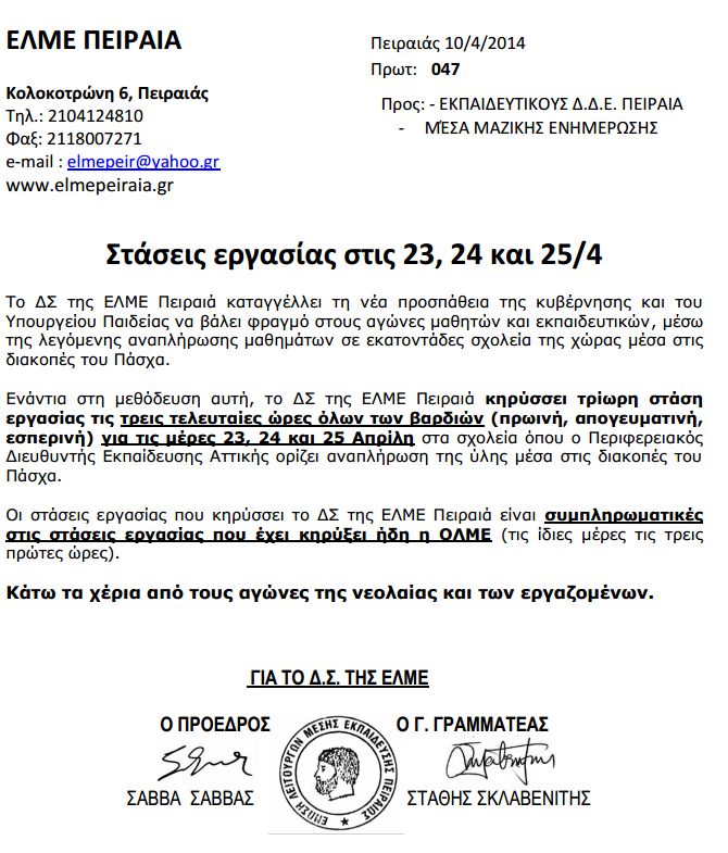 Δείτε παρακάτω την ανακοίνωση της ΕΛΜΕ Πειραιά σχετικά με τις στάσεις εργασίας στις 23, 24 και 25/4 που θα πραγματοποιήσει για την αναπλήρωση μαθημάτων λόγω καταλήψεων.