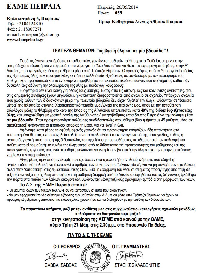 ΕΛΜΕ Πειραιά: Τράπεζα Θεμάτων- "ας βγει η ύλη και σε μια βδομάδα!"