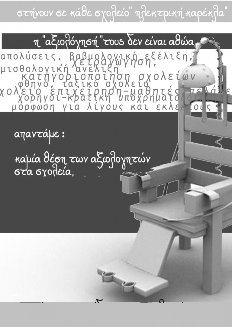 Ας πάψουν λοιπόν να μιλούν για αξιολόγηση που θα βελτιώσει την εκπαίδευση και θα βοηθήσει τον εκπαιδευτικό. Η πραγματικότητα δείχνει ότι όπου εφαρμόζεται, και μάλιστα με τον σκληρό και καθολικό τρόπο που προβλέπεται και για τη χώρα μας, πάντα ακολουθεί ένα ακόμα πιο σκληρό σύστημα, για να «διορθώσει» τις καταστροφικές συνέπειες που έχει το προηγούμενο! Αν επιτρέψουμε να εφαρμοστεί και σε μας, τα επόμενα βήματα θα είναι ακόμα πιο σκληρά, με πρώτο και κύριο τη σύνδεση της επαγγελματικής μας προοπτικής με τις επιδόσεις των μαθητών μας.