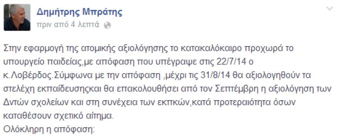 Στην εφαρμογή της ατομικής αξιολόγησης το κατακαλόκαιρο προχωρά το υπουργείο παιδείας,με απόφαση που υπέγραψε στις 22/7/14 ο κ.Λοβέρδος.Σύμφωνα με την απόφαση ,μέχρι τις 31/8/14 θα αξιολογηθούν τα στελέχη εκπαίδευσης και θα επακολουθήσει από τον Σεπτέμβρη η αξιολόγηση των Δντών σχολείων και στη συνέχεια των εκπκών,κατά προτεραιότητα όσων καταθέσουν σχετικό αίτημα.