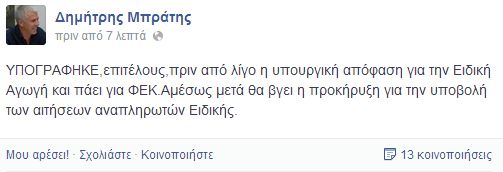 Συγκεκριμένα ο αιρετός έγραψε "ΥΠΟΓΡΑΦΗΚΕ,επιτέλους,πριν από λίγο η υπουργική απόφαση για την Ειδική Αγωγή και πάει για ΦΕΚ.Αμέσως μετά θα βγει η προκήρυξη για την υποβολή των αιτήσεων αναπληρωτών Ειδικής."