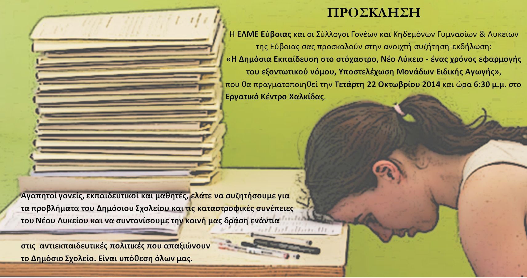 Στα πλαίσια των πρωτοβουλιών που αναπτύχθηκαν όλο το προηγούμενο διάστημα από την ΕΛΜΕ Εύβοιας, αναφορικά με την υπεράσπιση του Δημόσιου σχολείου, πραγματοποιήθηκαν τόσο κατά τη διάρκεια της σχολικής χρονιάς όσο και μέσα στο καλοκαίρι, επαφές και συναντήσεις με συλλόγους γονέων και κηδεμόνων Γυμνασίων και Λυκείων της Εύβοιας. Η αιχμή όλων αυτών των συναντήσεων είναι η δραματική κατάσταση που επικρατεί στη δημόσια εκπαίδευση με την υποχρηματοδότηση και την υποστελέχωση των σχολικών μονάδων, τις συγχωνεύσεις-καταργήσεις σχολείων, το κλείσιμο ειδικοτήτων στη Τεχνική Εκπαίδευση, την απαξίωση της Ειδικής Αγωγής, την προσχηματική αξιολόγηση και ιδιαίτερα το Νέο Λύκειο που, μέσα από έναν εξαντλητικό εξεταστικό μαραθώνιο, ετοιμάζει τα παιδιά μας για την αποτυχία και την απλήρωτη μαθητεία-κατάρτιση. Επειδή, ως εκπαιδευτικοί και γονείς έχουμε χρέος να υπερασπιστούμε το δικαίωμα όλων των παιδιών στη 12χρονη Δημόσια ΔΩΡΕΑΝ εκπαίδευση, βάζοντας φρένο στα σχέδια του Υπουργείου, καλούμε όλους τους γονείς, τους εκπαιδευτικούς και τους μαθητές σε κοινή εκδήλωση-συνάντηση την Τετάρτη 22 Οκτωβρίου, και ώρα 6:30 στο Εργατικό Κέντρο Χαλκίδας, ώστε να βρούμε μια κοινή γραμμή συμπόρευσης και να επιτύχουμε ένα καλύτερο συντονισμό της δράσης μας, με σκοπό την αντιμετώπιση των πολύ οξυμένων προβλημάτων.
