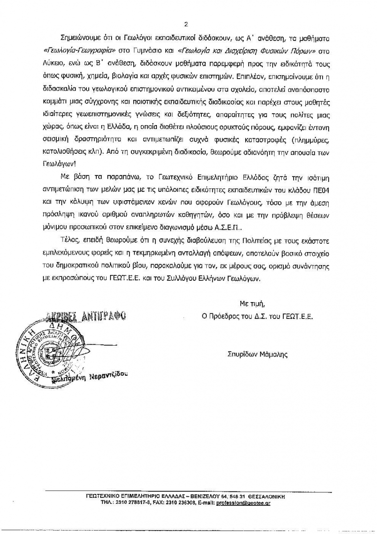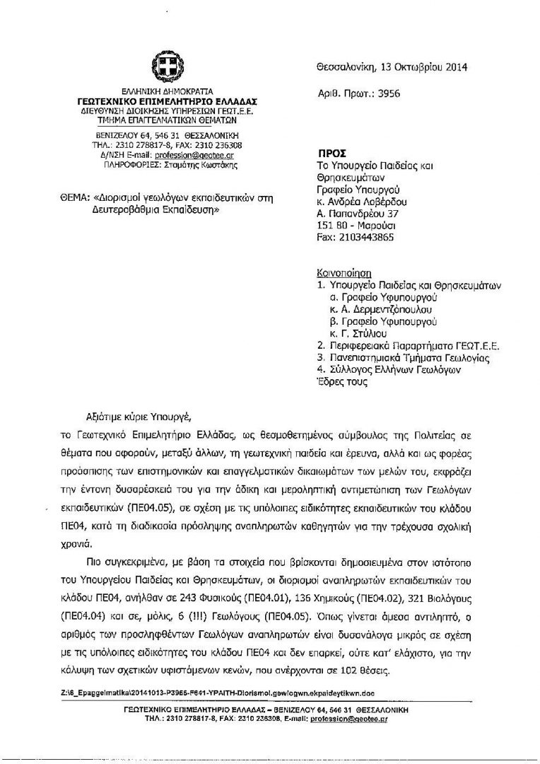 Επιστολή Διαμαρτυρίας του ΓΕΩΤΕΕ προς το Υπ. Παιδείας για την άδικη αντιμετώπιση των γεωλόγων αναπληρωτών