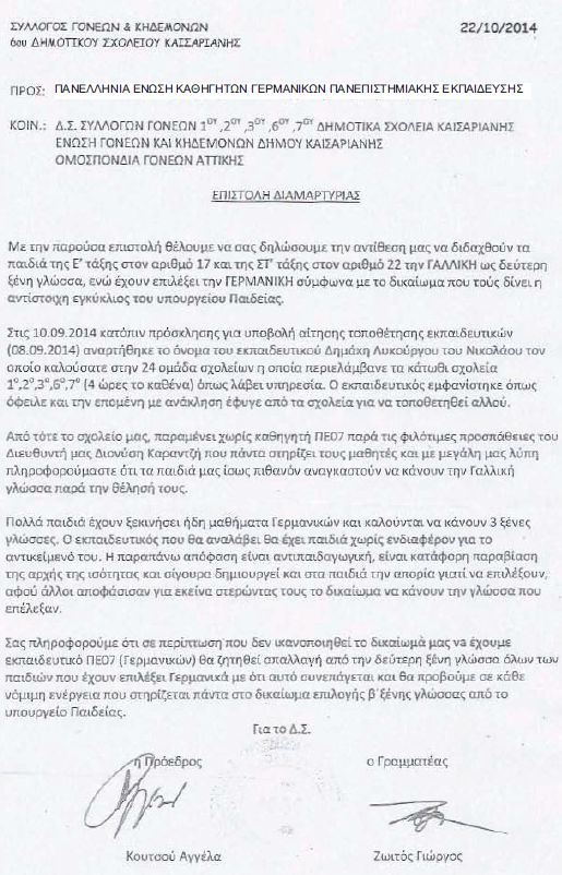 Σας πληροφορούμε ότι σε περίπτωση που δεν ικανοποιηθεί το δικαίωμά μας να έχουμε εκπαιδευτικό ΠΕ07 (Γερμανικών) θα ζητηθεί απαλλαγή από τη δεύτερη ξένη γλώσσα όλων των παιδιών που έχουν επιλέξει Γερμανικά με ότι αυτό συνεπάγεται και θα προβούμε σε κάθε νόμιμη ενέργεια που στηρίζεται πάντα στο δικαίωμα επιλογής β΄ ξένης γλώσσας από το υπουργείο Παιδείας.