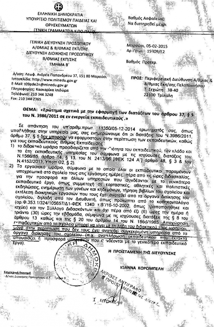 Η νέα πολιτική ηγεσία του Υπουργείου Παιδείας μέσω της προϊσταμένης της Διεύθυνσης Διοίκησης Προσωπικού της β/βάθμιας εκπαίδευσης εξέδωσε εγκύκλιο στην οποία διευκρινίζει ότι στους εκπαιδευτικούς(α/βαθμιας) και β/θμιας εκπαίδευσης δεν μπορούν να εφαρμοστούν οι διατάξεις του Ν.3986/2011 άρθρο 37 παράγραφος 5.