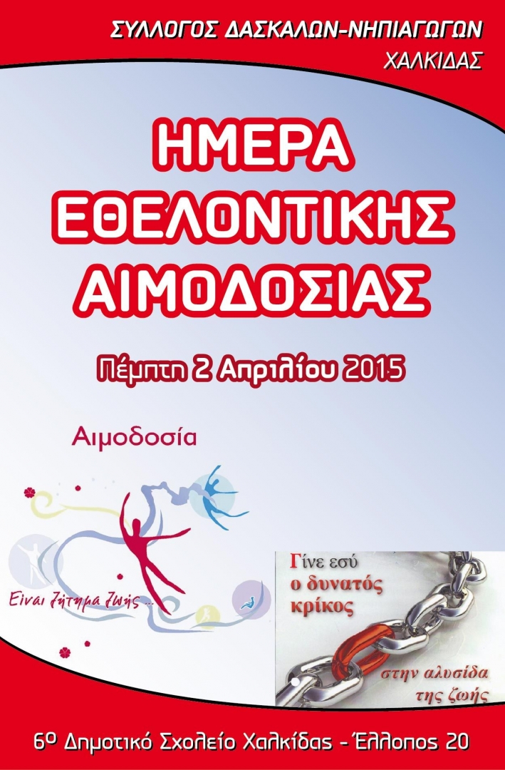 Ο Σύλλογος Δασκάλων - Νηπιαγωγών Χαλκίδας θα πραγματοποιήσει εθελοντική αιμοδοσία προκειμένου να ενισχυθεί η τράπεζα αίματος του Συλλόγου .