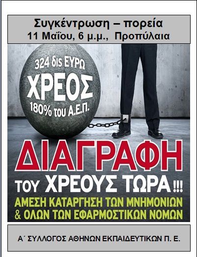 ΟΛΟΙ στη συγκέντρωση της Κίνησης για τη Διαγραφή του Χρέους, τη Δευτέρα 11 Μάη, στις 6 μ.μ., στα Προπύλαια