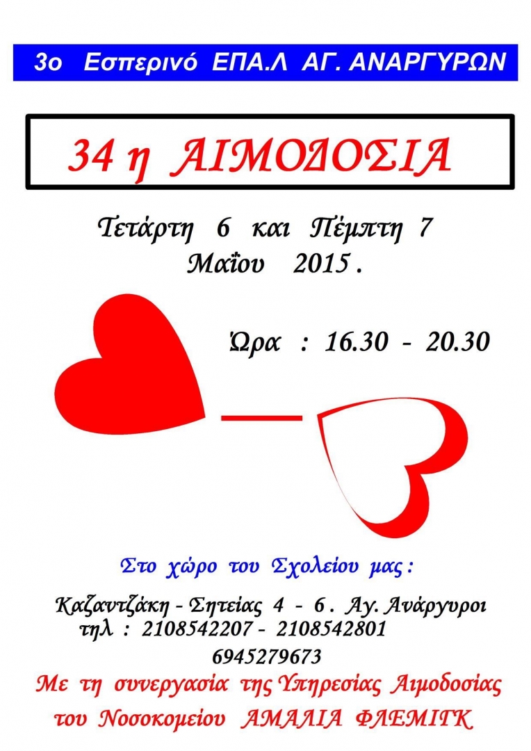 Ο διευθυντής και η Ομάδα αιμοδοσίας" του 3ου Εσπ. ΕΠΑΛ Αγ. Αναργύρων σας προσκαλούν στην 34 Αιμοδοσία μας, που πραγματοποιείται την Τετάρτη 6 και Πέμπτη 7 Μαϊου 2015 στο χώρο του σχολείου μας (Καζατζάκη- Σητείας 4-6) από 16:00έως 20!30 με τη συνεργασία της Υπηρεσίας Αιμοδοσίας του Νοσοκομείου "Αμαλία Φλεμινγκ"