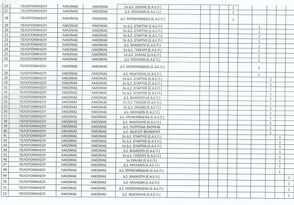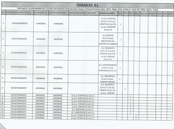 Σας γνωστοποιούμε τις οργανικές θέσεις ανά κλάδο εκπαιδευτικών που συστάθηκαν και κατανεμήθηκαν από τη Διεύθυνση ΠΕ Λακωνίας