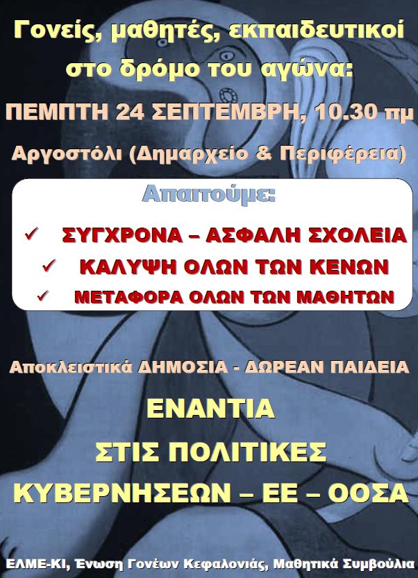 Κινητοποίηση σχολείων Πέμπτη 24 Σεπτέμβρη 10.30 πμ στο Αργοστόλι