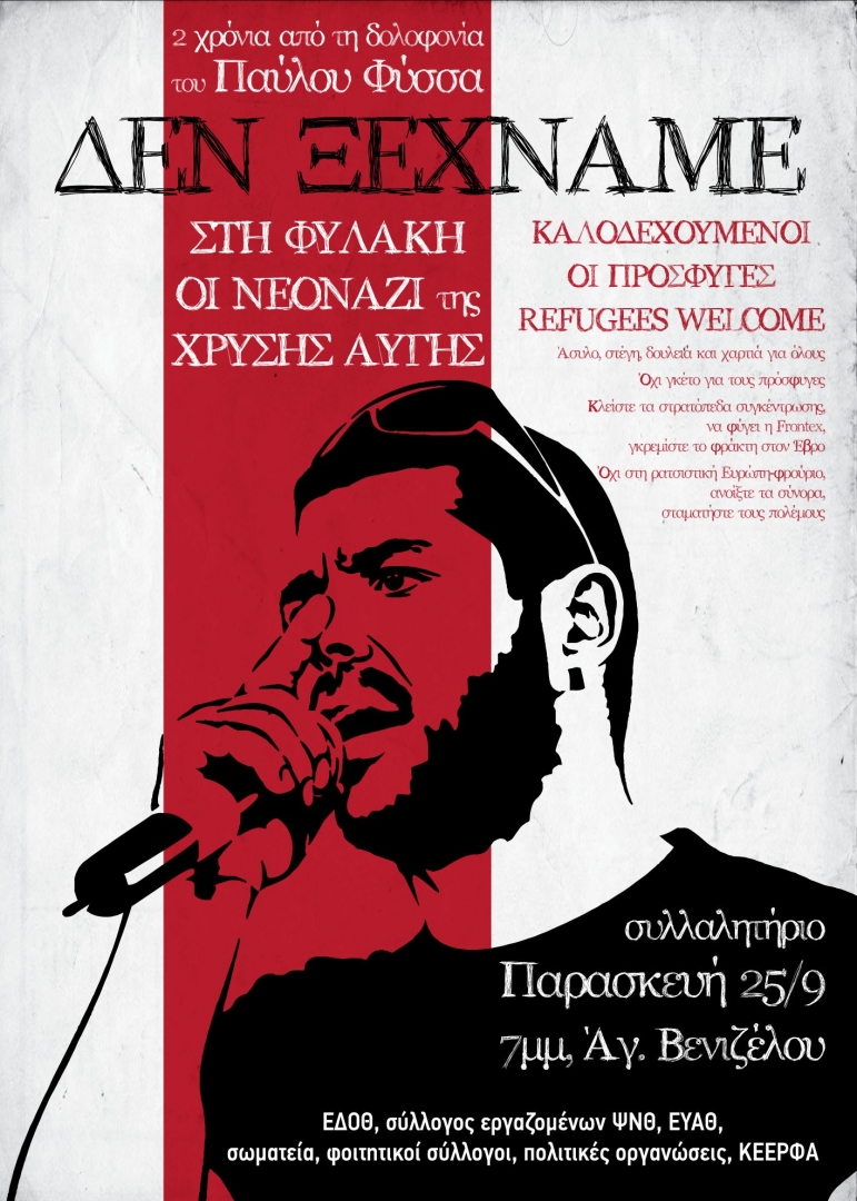 Αγώνας για τον τερματισμό των πολέμων – να σταματήσει η εκμετάλλευση λαών και χωρών. Το Δ.Σ. σε μια τέτοια κατεύθυνση καλεί τους συναδέλφους να συμμετέχουν στην αντιφασιστική κινητοποίηση την Παρασκευή 25/9, στις 7:00 μ.μ στο άγαλμα Βενιζέλου που είναι αφιερωμένη στον Παύλο Φύσσα που δολοφονήθηκε πριν δύο χρόνια από τους φασίστες της Χρυσής Αυγής και να στραφούν και ενάντια στους ιμπεριαλιστικούς πολέμους απαιτώντας λύση των προβλημάτων των προσφύγων και των μεταναστών.