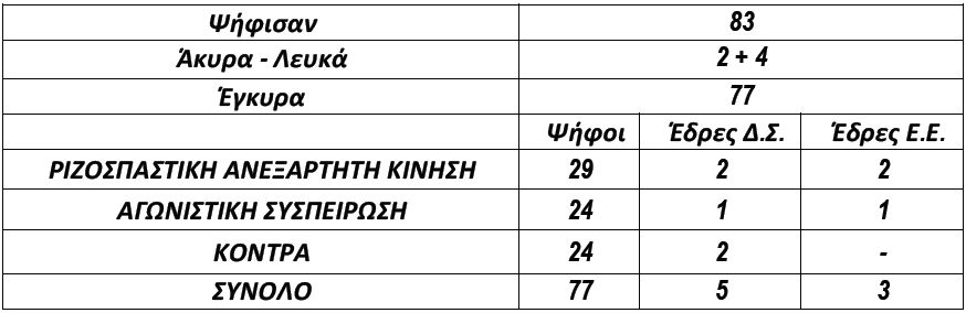 Η 5η έδρα στο Δ.Σ. κατανεμήθηκε με κλήρωση καθώς οι παρατάξεις Αγωνιστική Συσπείρωση και Κόντρα είχαν το ίδιο αδιάθετο υπόλοιπο ψήφων στη Β΄ κατανομή (9). Το εκλογικό μέτρο ήταν 15 και στην Α΄ κατανομή πήραν όλες οι παρατάξεις από 1 έδρα και η Ριζοσπαστική Ανεξάρτητη Κίνηση 1 έδρα στη Β΄ κατανομή, καθώς είχε το μεγαλύτερο αδιάθετο υπόλοιπο ψήφων (14).