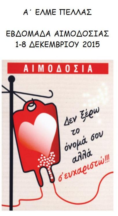 Καλούνται τα Μέλη της Α΄ΕΛΜΕ ΠΕΛΛΑΣ να συμμετάσχουν στην εθελοντική αιμοδοσία του μηνός Δεκεμβρίου στο Νοσοκομείο της Έδεσσας καθημερινά το πρωί από τις 9.00-13.00 μμ και απόγεμα 18.30-19.30 ,1-8 Δεκεμβρίου 2015.Στην Αριδαία μπορούν να δώσουν την Τρίτη 1 Δεκεμβρίου στο Κέντρο Υγείας Αριδαίας.