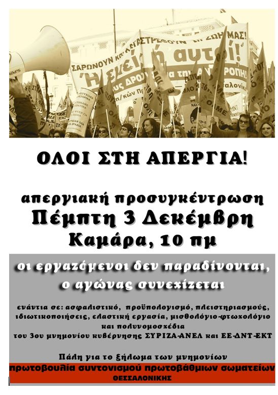 ΠΕΜΠΤΗ 3 ΔΕΚΕΜΒΡΗ ΟΛΟΙ –ΟΛΕΣ ΣΤΗΝ ΑΠΕΡΓΙΑ!
