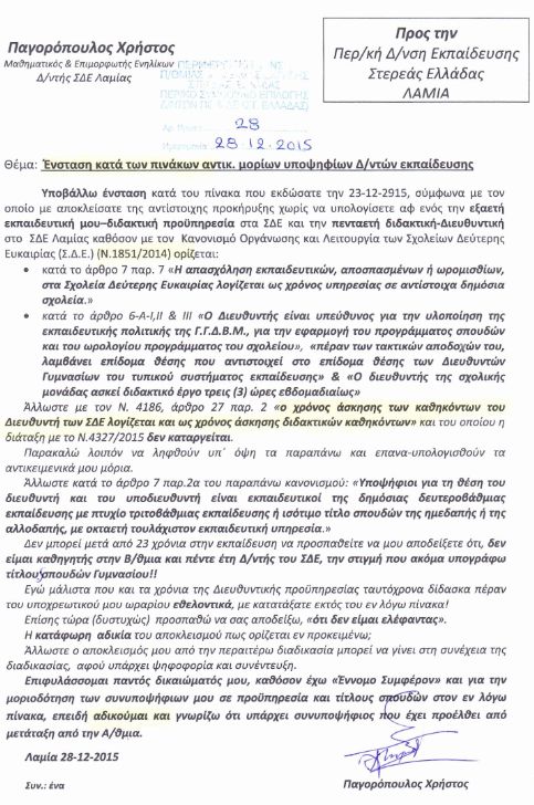 Διαβάστε παρακάτω την επιστολή - Καταγγελία του Παγορόπουλου Χρήστου και την ένσταση κατά των πινάκων αντικ.μορίων υποψηφίων Διευθυντών εκπαίδευσης που υπέβαλλε.