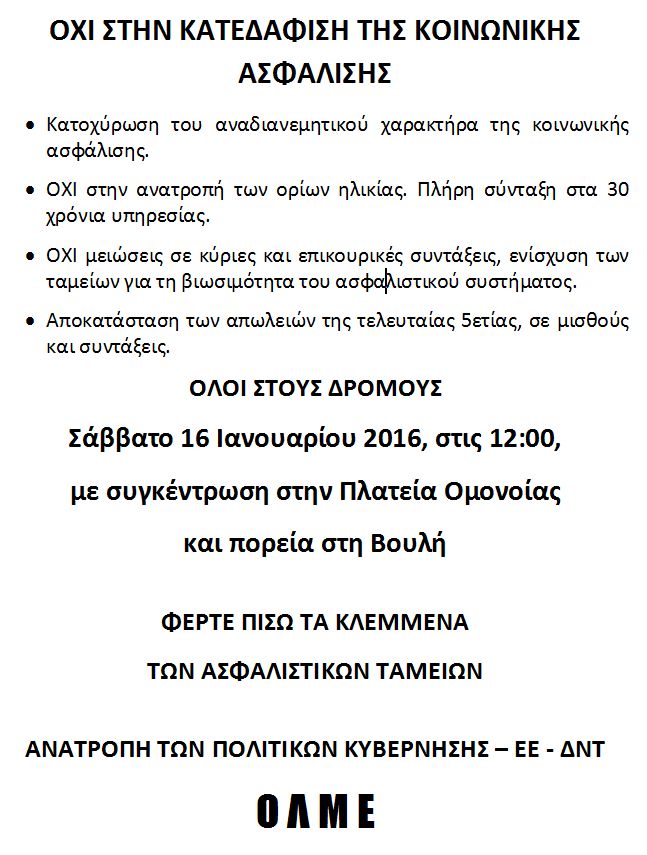 Όπως έχετε πληροφορηθεί, ήδη, η Εκτελεστική Επιτροπή της Α.Δ.Ε.Δ.Υ., υλοποιώντας την από 05/01/2016 ΑΠΟΦΑΣΗ του Γενικού Συμβουλίου, για προγραμματισμό των αγωνιστικών και απεργιακών κινητοποιήσεων των εργαζομένων στο Δημόσιο Τομέα ενάντια στην προωθούμενη κατεδάφιση του συστήματος Κοινωνικής Ασφάλισης και στα νέα σκληρά μέτρα που ετοιμάζονται – για ακόμη μία φορά – να επιβάλουν στον ελληνικό λαό Κυβέρνηση, Ευρωπαϊκή Ένωση και ΔΝΤ, προσδιόρισε τη διοργάνωση παλλαϊκών συλλαλητηρίων ως εξής:
