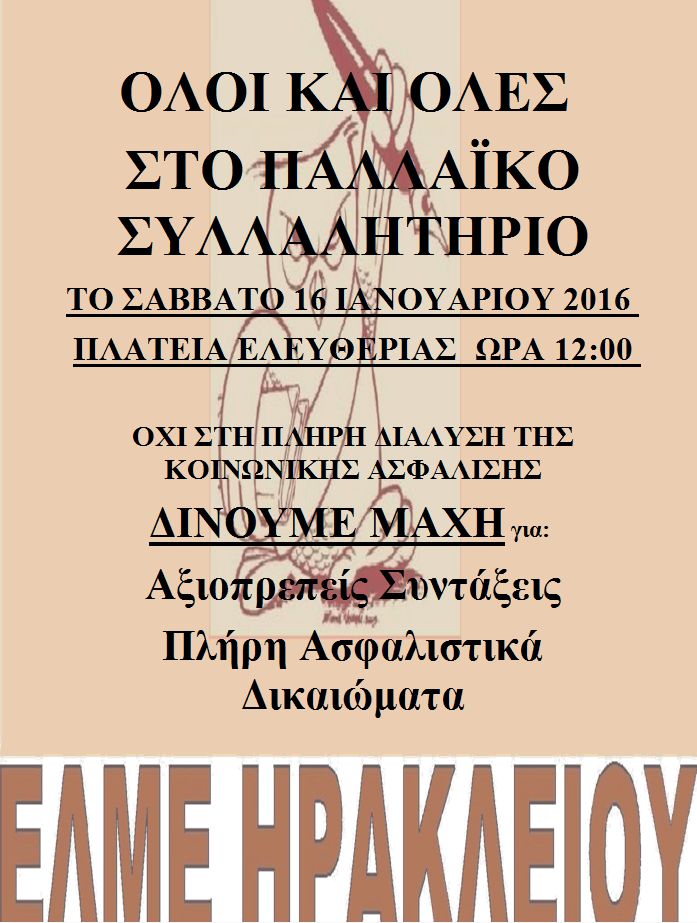 Το Δ.Σ. της ΕΛΜΕ Ηρακλείου σε τακτική συνεδρίασή του (11/1/2016) με θέμα την ψήφιση του νέου νομοσχεδίου για το ασφαλιστικό τέθηκε ομόφωνα αντίθετο στο προσχέδιο νόμου που θα ολοκληρώσει τη διάλυση της κοινωνικής ασφάλισης. Οι διαβουλεύσεις συγκυβέρνησης ΣΥΡΙΖΑ – ΑΝΕΛ και Μηχανισμών Επιτήρησης (!!) της χώρας διαλύουν ότι έχει απομείνει από προηγούμενες νομοθετικές πράξεις που έσωσαν τη χώρα και τους εργαζόμενους .