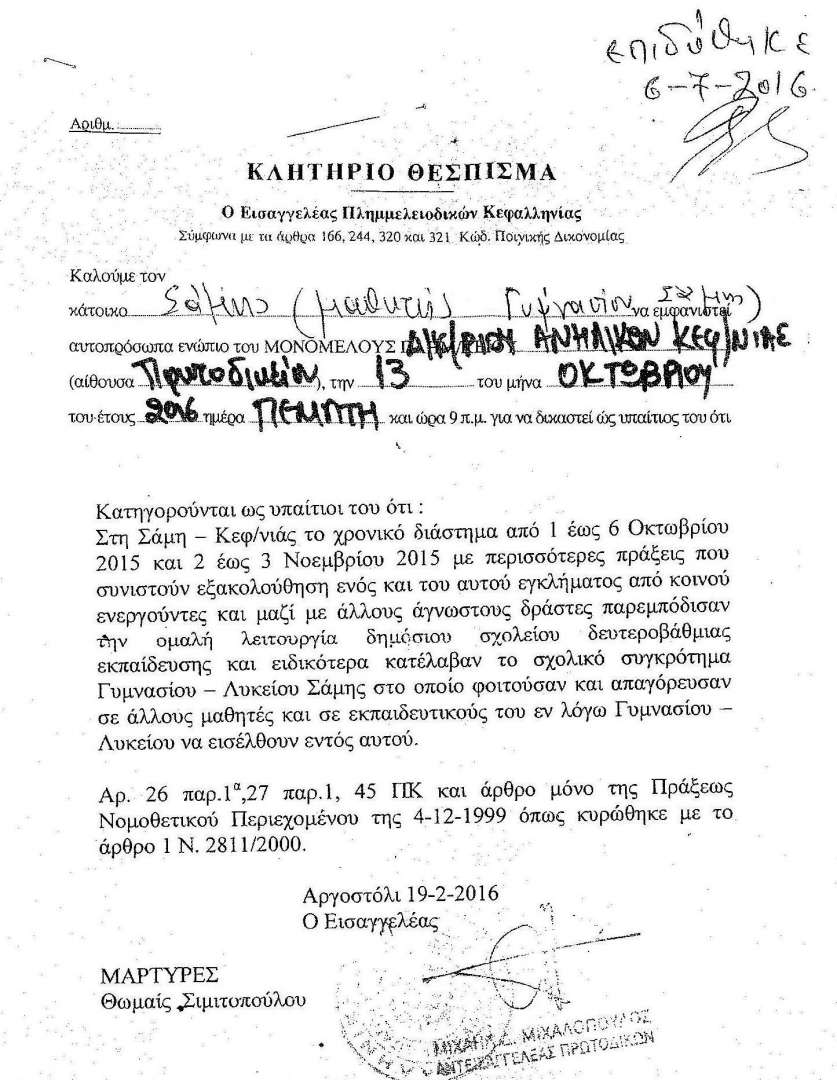 Στη συνέχεια έγινε παράσταση στην εισαγγελία Κεφαλονιάς, όπου διαμηνύθηκε ότι δε μπορεί να γίνει αποδεκτή η ποινικοποίηση των αγώνων ούτε το να λειτουργούν σχολεία με αστυνομία - εισαγγελείς και το να σέρνονται μαθητές στα δικαστήρια.