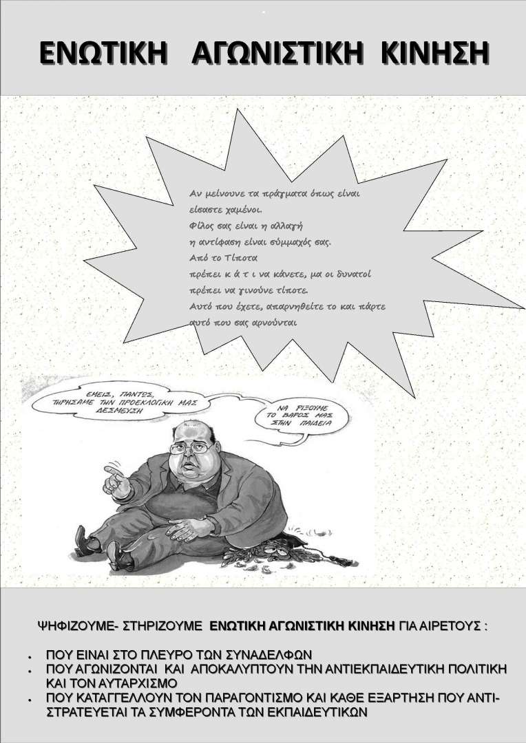 Η εκπαιδευτική πρόταση της κυβέρνησης είναι άλλη μία προκλητική μεταστροφή της από όσα υποσχέθηκε, ορισμένες φορές και μετεκλογικά, και σύνταξή της με τις πλέον επιθετικές και κοινωνικά ανάλγητες εκπαιδευτικές απόψεις. Αυτό δεν μπορεί να αλλάξει όσο και αν ο κ. Φίλης με κατά καιρούς πυροτεχνήματα προσπαθεί να μετατοπίσει την ατζέντα της συζήτησης για την ουσία των συντελούμενων αλλαγών. Είναι χρέος του ζωντανού, μαχόμενου συνδικαλιστικού κινήματος στην εκπαίδευση να αποκαλύψει και να ακυρώσει αυτά τα σχέδια. Σ΄αυτό το στόχο εντάσσουμε και την δράση μας στις εκλογές για τα υπηρεσιακά συμβούλια. Γνωρίζουμε ότι τα όργανα αυτά επιχειρείται να χρησιμοποιηθούν ως μηχανισμοί εξωραϊσμού των αντιδράσεων των εργαζομένων και ενσωμάτωσης του συνδικαλιστικού κινήματος στη λογική της συνδιαχείρισης όλων των εκπαιδευτικών πολιτικών που έχουν εφαρμοσθεί μέχρι τώρα οι οποίες καμία σχέση δεν έχουν με τα λαϊκά αιτήματα και τις διεκδικήσεις του μαχόμενου κλάδου των εκπαιδευτικών. Όμως οφείλουμε να μην αφήνουμε κανένα πεδίο αντιπαράθεσης και υπεράσπισης των συμφερόντων των συναδέλφων αναξιοποίητο. Διεκδικούμε παρουσία στα Υπηρεσιακά Συμβούλια, για να καταγγέλλουμε τις αυθαιρεσίες της Διοίκησης, να αποκαλύπτουμε τον παραγοντισμό, να είμαστε στο πλευρό των δικαίων αιτημάτων των εκπαιδευτικών.