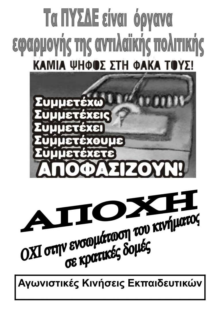 Δυνάμεις που ενώ δηλώνουν ότι το σύστημα και οι κυβερνήσεις του, έχουν κηρύξει ταξικό πόλεμο, κάθονται στο ίδιο τραπέζι με τους θύτες, ώστε τα θύματα να προκύψουν “δίκαια”, “νόμιμα” και με “διαφάνεια”(με αναρτημένα τα μόριά τους!!!). Ενώ δηλώνουν ότι δεν έχουν ψευδαισθήσεις για τα όργανα αυτά που είναι ιμάντες εφαρμογής της κυβερνητικής πολιτικής, “λιπαίνουν” τη λειτουργία τους, βάζοντας την υπογραφή τους σε όλες τις υπηρεσιακές μεταβολές που γίνονται με το υπάρχον αντιδραστικό νομικό πλαίσιο. Kάθε φορά που η κυβέρνηση εμφανίζει μια νέα αντιδραστική ρύθμιση, στήνεται παράσταση διαμαρτυρίας και αποχής από τα όργανα αυτά, για να επανέλθουν αργότερα για να “ελέγξουν” την εφαρμογή της. Καυχώνται οτι κατόπιν ενεργειών τους ακυρώθηκαν διαδικασίες εξπρές και έγιναν όλα σύμφωνα με τους (άδικους) νόμους. Αρνούνται λένε να αφήσουν “χώρο” στον κυβερνητικό συνδικαλισμό -αναδεικνύοντας τα τελευταία χρόνια πολλούς αιρετούς-, δεν ανοίγουν όμως δρόμο για την οικοδόμηση ανεξάρτητου ταξικού συνδικαλιστικού κινήματος, χειραφετημένου απο το κράτος. Με τη συμμετοχή τους αρνούνται, αντιστρατεύονται αυτή την αναγκαιότητα.