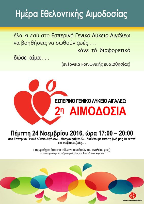 Την Πέμπτη 24 Νοεμβρίου 2016, από τις 17:00 ως τις 20:00, θα πραγματοποιήσουμε τη δεύτερη εθελοντική αιμοδοσία στο χώρο του σχολείου μας, στην οδό Μοσχονησίων 23, στο Αιγάλεω, και θέλουμε να είστε όλοι εκεί!