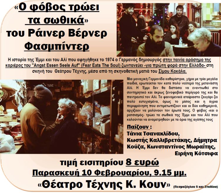 Ο σύλλογος «Αθηνά» σας καλεί στη Θεατρική παράσταση «ο φόβος τρώει τα σωθικά» του Ράινερ Βέρνερ Φασμπίντερ την Παρασκευή 10 Φεβρουαρίου, 9.15 μμ. στο Θέατρο Τέχνης Κ. Κουν, Πεσμαζόγλου 5 και Σταδίου, έχοντας εξασφαλίσει τιμή εισιτηρίου 8 ευρώ.