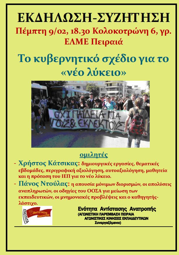 Το κυβερνητικό σχέδιο για το "νέο λύκειο", εκδήλωση-συζήτηση στις 9/2 στην ΕΛΜΕ Πειραιά