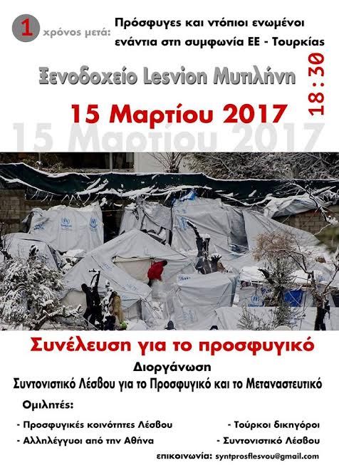 Την Τετάρτη 15/03 στις 18:30 στο Ξενοδοχείο Λέσβιον σας καλούμε να συμμετέχετε στην εκδήλωση του Συντονισμού Λέσβου για το Προσφυγικό - Μεταναστευτκό με θέμα ‘’Ενα χρόνο μετά την συμφωνία ντροπής ΕΕ – Τουρκίας, πρόσφυγες και ντόπιοι παλεύουμε για την κατάργησή της’’.