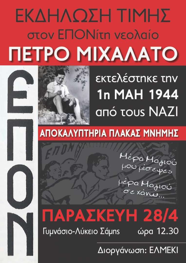 Παρασκευή 28 Απρίλη, 12.30 το μεσημέρι, στο Γυμνάσιο – Λύκειο Σάμης, αποκαλυπτήρια πλάκας μνήμης προς τιμήν του εκτελεσμένου από τους ναζί, την 1η Μάη του 1944, Π. Μιχαλάτου.