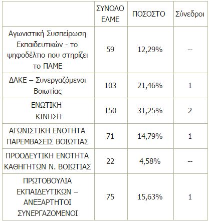 Ακολουθούν τα αποτελέσματα των εκλογών της ΕΛΜΕ Βοιωτίας για την ανάδειξη αντιπροσώπων για το 18ο συνέδριο της ΟΛΜΕ: