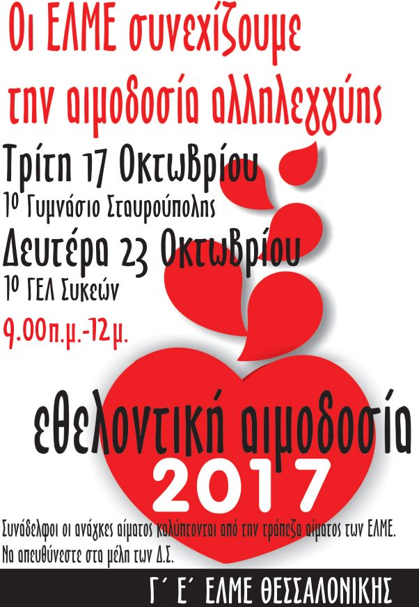 Τα Δ.Σ. σας καλούν να προσέλθετε μαζικά σε αυτήν την προσφορά ανθρωπιάς και αλληλεγγύης. Ημέρες ΑΙΜΟΔΟΣΙΑΣ ορίστηκαν: η Τρίτη 17 Οκτωβρίου, ώρα 9:00 π.μ έως 12.00 μ.μ. στο 1ο Γυμνάσιο Σταυρούπολης και η Δευτέρα 23 Οκτωβρίου, ώρα 9:00 π.μ έως 12.00 μ.μ. στο 1ο ΓΕΛ Συκεών. Να μην σκεφτούμε: δε μου χρειάστηκε ποτέ αίμα, αν χρειαστώ θα δούμε…. Η ενίσχυση της τράπεζας αίματος των σωματείων μας, των ΕΛΜΕ στηρίζεται στην προσφορά αίματος των εθελοντών συναδέλφων και αποβλέπει :