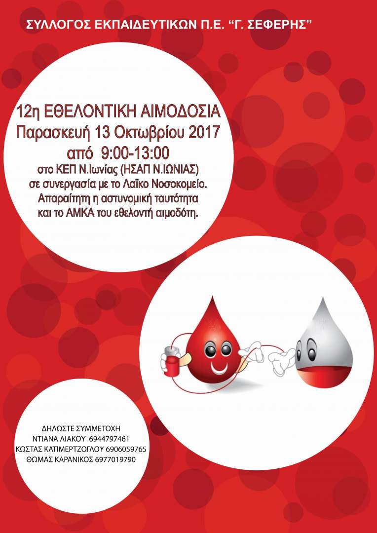 12η Εθελοντική αιμοδοσία - Παρασκευή 13/10 από 9:00- 13:00 στο ΚΕΠ Ν. Ιωνίας