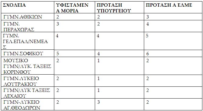 Ως Α΄ Ε.Λ.Μ.Ε. Κορινθίας εμμένουμε στην αρχική πρότασή μας (εκτός από το ΓΥΜΝΑΣΙΟ ΚΑΙ ΤΟ ΛΥΚΕΙΟ ΑΓΙΩΝ ΘΕΟΔΩΡΩΝ για τα οποία ,ενώ είχαμε προτείνει να παραμείνουν ως έχουν, είμαστε θετικοί στην αυξημένη κατά 1 μονάδα μοριοδότησή τους, αλλά να υιοθετηθεί και η πρότασή μας που αφορά και τα άλλα σχολεία).