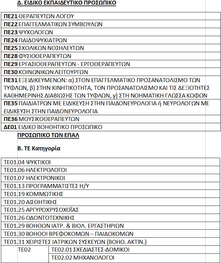 Επειδή στις μέχρι τώρα συναντήσεις μας και κυρίως στην συνεργασία μας με τον Διευθυντή Ειδικής Αγωγής και Εκπαίδευσης υποστηρίζονταν από την πλευρά σας ιδιαίτερα η ρύθμιση της άνισης και άδικης μεταχείρισης του Ε.Β.Π. σεσχέση με το αντίστοιχο προσωπικό των ΕΠΑΛ, ζητάμε σήμερα, έστω και την ύστατη στιγμή, να διορθώσετε το αρ. 29 στο κεφάλαιο Δ και όπου αναγράφεται το ΔΕ01 ΕΙΔΙΚΟ ΒΟΗΘΗΤΙΚΟ ΠΡΟΣΩΠΙΚΟ σε ΤΕ01 ΕΙΔΙΚΟ ΒΟΗΘΗΤΙΚΟ ΠΡΟΣΩΠΙΚΟ.