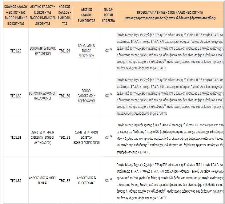 Συγκεκριμένα, ενώ στα ΕΠΑΛ οι κατέχοντες πτυχίο μέσης τεχνικής σχολής ή ΤΕΛ , ή ΕΠΑΛ ή Β΄κύκλου ΤΕΕ, ή Ενιαίου Πολυκλαδικού Λυκείου ή ΙΕΚ , ή άλλος ισότιμος τίτλος σπουδών, αντίστοιχης ειδικότητας Βοηθών Βρεφονηπιοκόμων – Παιδοκόμων κατατάσσονται στην κατηγορία ΤΕ01.30, αντίθετα στην Ειδική εκπαίδευση, οι κατέχοντες τα ίδια τυπικά προσόντα, κατατάσσονται στην κατηγορία ΔΕ01.