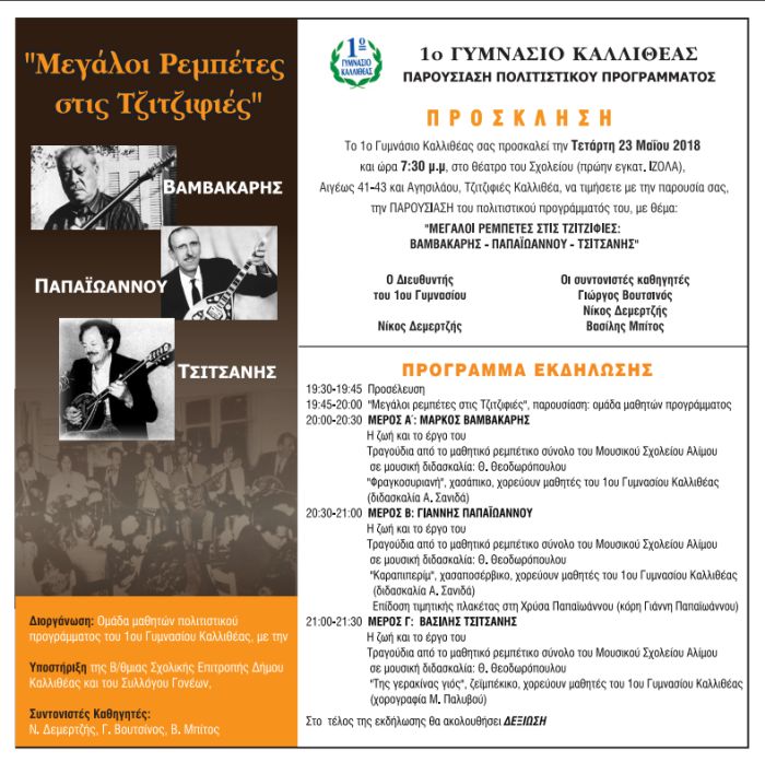 ΔΙΟΡΓΑΝΩΣΗ: Ομάδα μαθητών πολιτιστικού προγράμματος 1ου Γυμνασίου Καλλιθέας με ΣΥΝΤΟΝΙΣΤΕΣ το Διευθυντή του σχολείου Νίκο Δεμερτζή και τους Καθηγητές Γιώργο Βουτσίνο και Βασίλη Μπίτο.