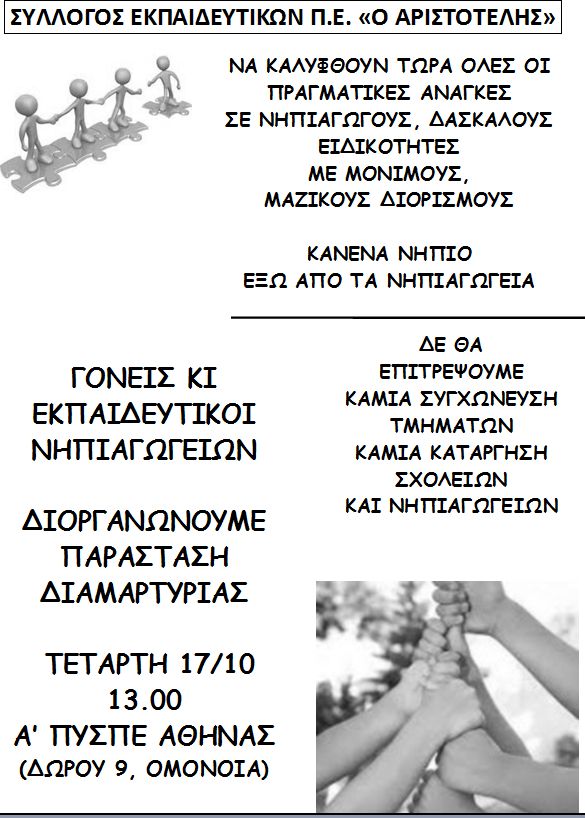 Για το λόγο αυτό καλούμε τους γονείς των ολοήμερων νηπιαγωγείων της Αθήνας που δε λειτουργούν, την Τετάρτη 17 Οκτωβρίου στις 13:00, σε κοινή παράσταση διαμαρτυρίας στην Α΄ Διεύθυνση (Δώρου 9, Ομόνοια) ώστε: