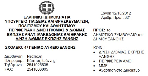 Αυτή η επιστολή αποτελεί ένα ακόμη διάβημα κατάδειξης μιας συνεχιζόμενης δωδεκαετούς αδιαφορίας από πλευράς των αρμοδίων αρχών (Νομαρχίας μέχρι το 2011 και Δημαρχίας στη συνέχεια) σχετικά με την απόκτηση κτιρίου του 4ου Γενικού Λυκείου Ξάνθης, η οποία πλέον εξελίσσεται σε κατάφορο εμπαιγμό.