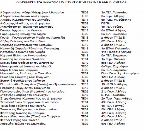 ΑΓΩΝΙΣΤΙΚΗ ΠΡΩΤΟΒΟΥΛΙΑ ΓΙΑ ΤΗΝ ΑΝΑΤΡΟΠΗ ΣΤΟ ΠΥΣΔΕ Α΄ΑΘΗΝΑΣ