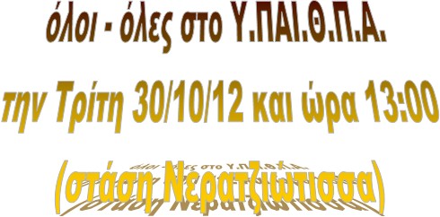 Σήμερα Παρασκευή 26/10/2012 και ώρα 12.00 συγκεντρωθήκαμε στα γραφεία της ΔΟΕ, Νηπιαγωγοί από τους Συλλόγους των Εκπαιδευτικών Π.Ε. Συζητήθηκε η κινητοποίηση των Νηπιαγωγών την Τρίτη 30/10/2012 και ώρα 13:00 και η απάντηση του Ειδικού Γραμματέα του Υ.ΠΑΙ.Θ.Π.Α. Σ. Γκλαβά (25/10/2012) στην από 15/10/2012 επιστολή της ΔΟΕ σχετικά με την εγκύκλιο με αρ. πρωτ. Φ.32/339/124196/Γ1/11-10-2012 του Υ.ΠΑΙ.Θ.Π.Α. για τη δυνατότητα πρόωρης αποχώρησης των νηπίων των Ολοήμερων Νηπιαγωγείων.