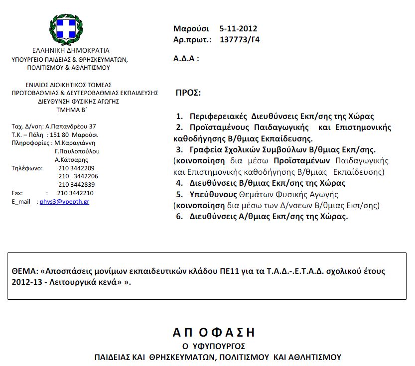 Αποσπάσεις μονίμων εκπαιδευτικών κλάδου ΠΕ11 για τα Τ.Α.Δ.-Ε.Τ.Α.Δ. σχολικού έτους 2012-2013-Λειτουργικά κενά