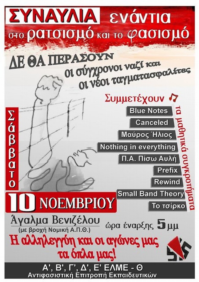 Την αντιφασιστική συναυλία διοργανώνουν οι Α, Β, Γ, Δ, Ε ΕΛΜΕ Θεσσαλονίκης και η αντιφασιστική επιτροπή εκπαιδευτικών.